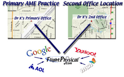Additional Listings. All AMEs are entitled to one free basic listing. If you want additional listings to promote a 2nd location or to attract more pilots, then sign up here. If you have 2 practice locations, this is a must. It is also acceptible to add listings to adjacent Zip and Area codes for publicity only--in this situation, your actual address will still show up on searches of adjacent regions. This is analagous to submiting your Town A practice info in neighboring Town B's phone book to draw pilots from their. Many AMEs benefit from this strategy because they're near borders or are amidst dense multiple Zip codes or overlapping area codes, give us the address and Phone number of the additional location(s) you want published and inidicate if it is an actual separate practice location or just for greater publicity. |